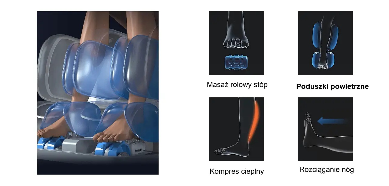 • Wielostrefowy masaż powietrzny – poduszki powietrzne obejmują ramiona, barki, łydki i stopy, delikatnie uciskając i rozluźniając mięśnie, poprawiając krążenie i uczucie lekkości nóg.